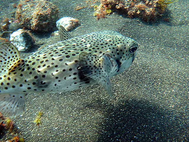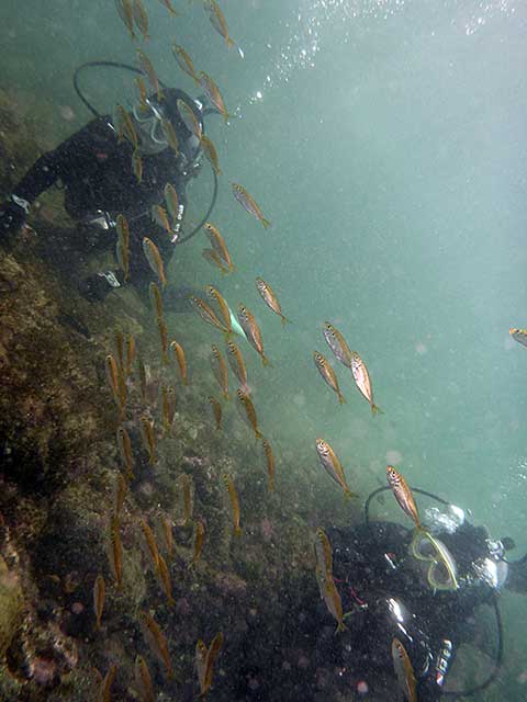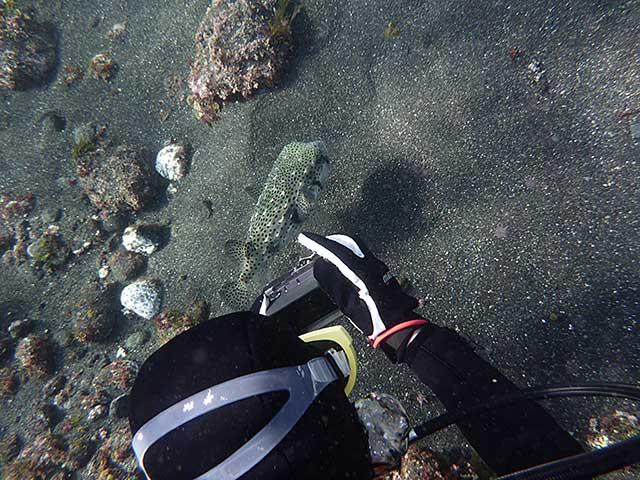 午後からはしっかり体験ダイビングで、底土の沖まで出て行って、体験ダイビング経験者でもあり、呼吸や耳抜きも問題もなく、水の中でも上手に泳いで、アオウミガメを見られたり、ほかにもキホシスズメダイのチョイ集まりや、サザナミフグにネズミフグ、オレンジ色が鮮やかなキンギョハナダイなんかも見て頂き、底土をグルッと回って楽しんで頂けました。