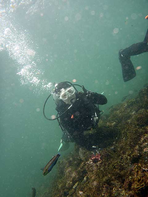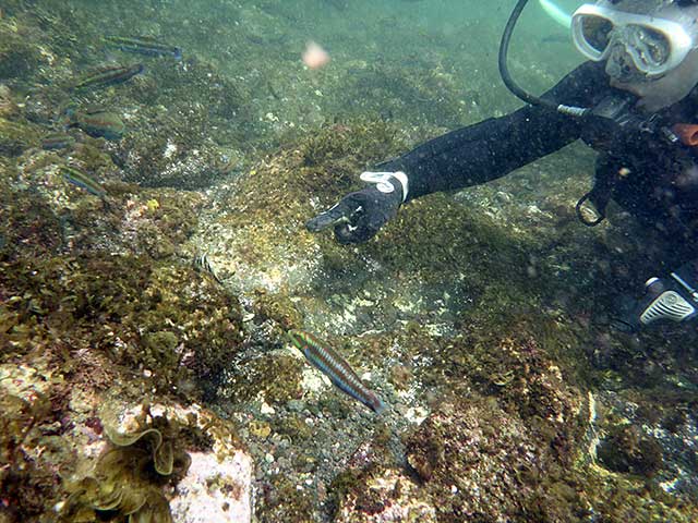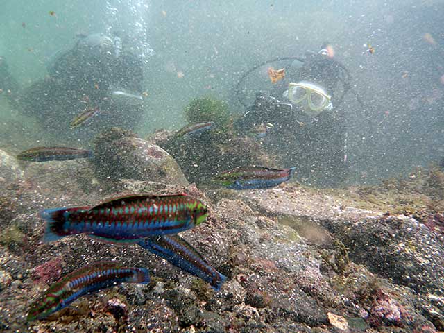 午前中は、体力的に自信ないとのことで、手軽に体験ダイビングでタイドプールでゆっくりのんびり潜る感じで、初めは少し緊張もされていたようですが、慣れてくれば笑顔でピースサインもしたりして、たくさん寄ってくるニシキベラや、ウミウシの仲間なんかを見ながら湾の中を回ってみたり。