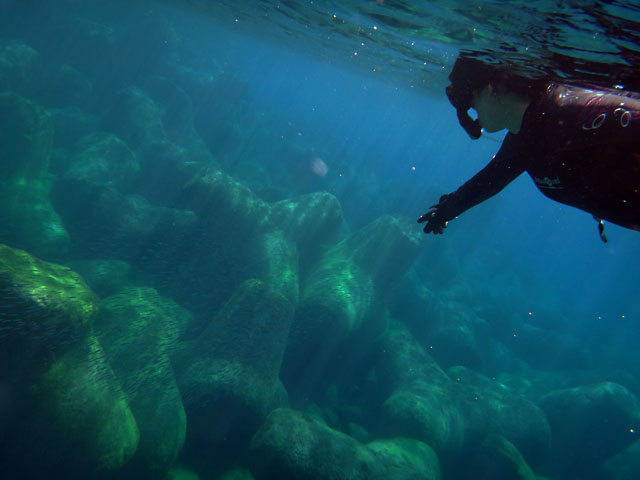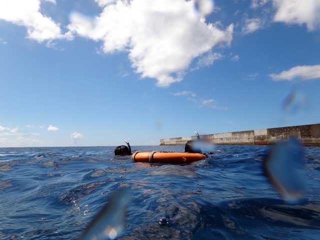 今日はカメを狙って、攻めるスノーケリングと言う事で、こちらに来る前にプールでスノーケリングの練習もしてこられたということで、凪いでる八重根を泳ぎまくってアオウミガメもたくさん見つけたりもして、ご持参されたハンディムービーで魚達を取りまくったり、キビナゴの群れをみたり、水面付近にはアオリイカの子どもや、イトヒキアジもすすっと通り過ぎたりもして、ナンヨウツバメの子ども達もたまっていたりもしてました。