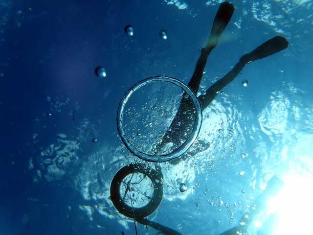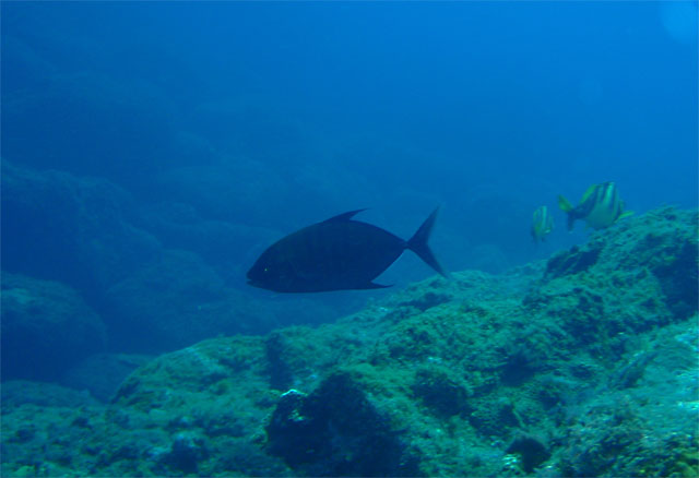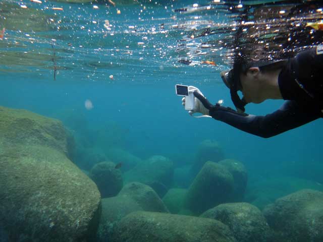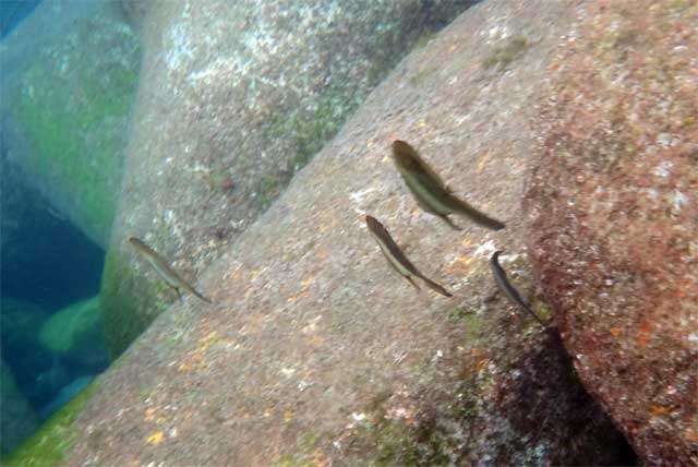 タイドプールでは見られないニザダイやメジナなどの大きな魚や、キホシスズメダイやソラスズメダイ、クロユリハゼとゼブラハゼっぽいたくさんの魚の群れもおりまして、水も蒼く抜けて空も気持ち良い白い雲もあるんで、バブルリングも作ったりもして、