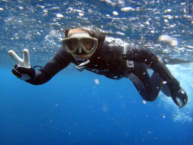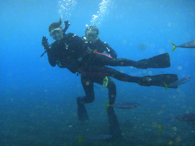 なんだかんだで、穏やかなところで安心して練習できれば、大抵は大丈夫なもんですので、たくさんのムロアジを見ながら笑顔も出てきて、最後の方にはお姫様だっこみたいな余裕のポーズで。