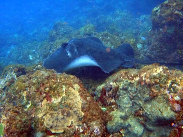 午前中はまだ雨もシトシトと降っていて、外海もそこまで荒れてはいませんでしたので、岩場を降りてアライケへ、湾になってるところは波もなく落ち着いて練習できて、コガシラベラや、ニシキベラ、ミヤコキンセンスズメダイや、シマスズメダイ、オヤビッチャなどみて、ちょっと沖にでてみれば、浅場で大きなマダラエイが休んでおりました。