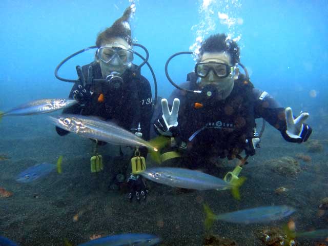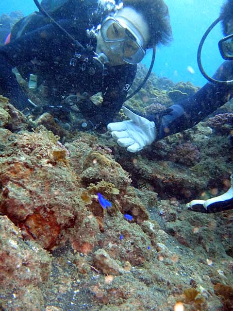 午後からは、底土で体験ダイビング。ショップで説明をしたあと、足のつく穏やかなタイドプールで練習してたんですが、怖さが先だちなかなか水の中での呼吸が落ち着かず・・・・・呼吸はしっかりできてますので、あとは心の持ちような感じでしたので、ゆっくりゆっくり本当に少しずつ水顔をつけるのを慣れて頂き、なんとか魚がたくさんのところで潜って頂けました、
