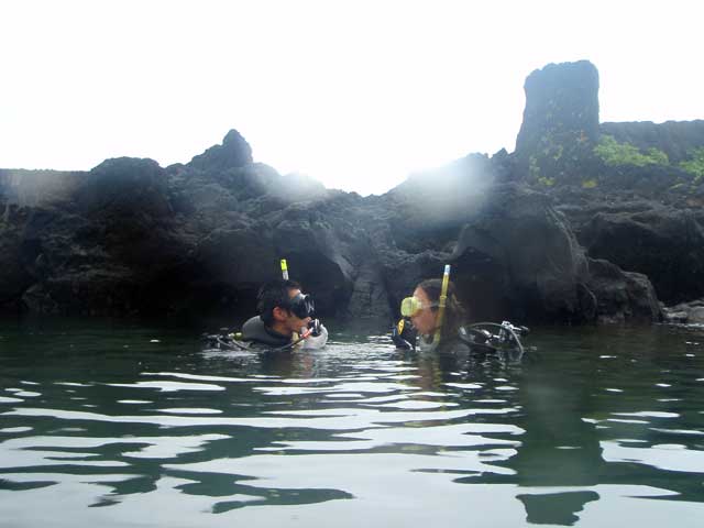降る雨止まず、時折バケツをひっくり返したような土砂降りになっていた今日の八丈島。海の方は、南西側は大荒れでばっしゃんばっしゃんでしたので、本日は人ごみ避けてペッタリ凪ぎてるアライケで体験ダイビング。
