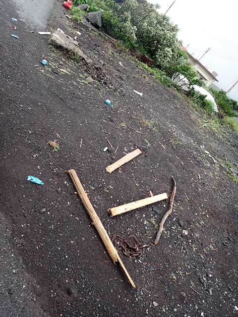 台風4号の直撃はなかったものの、昨晩には最大瞬間風速28.8m/sを記録して、南風ですし潮位もあがっていきている頃だったので、南西側の海岸線は道までうねりが押し寄せていたらしく、砂利を片づけた跡もあり、小石や流木やプラスチックの漂流物なんかも岸のかなり上まであがっていたりして、
