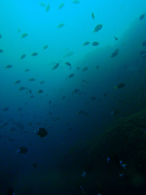 ナズマドも、夕方エントリーでしたが、南からの潮が結構強くその潮が冷たい水をどんどんと送り込んできているようで、魚達が暖かいところに集まっているせいか、魚影は濃い感じを受けますが、今日は、暖かいところの透明度も悲しいくらいに悪かったです。