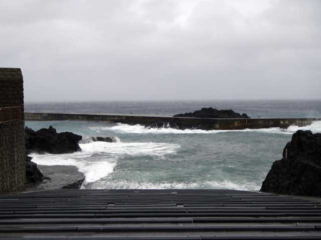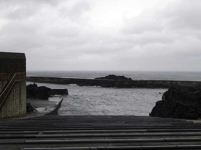 北東側は風も相まってパッと見大荒れ、ジッとみてると潮がバチバチ飛んでくるそんな様相。まぁ、船上げもしてるんで、神湊以外潜水自粛ということなんですが・・・ さすがにこの強い北風で神湊もバシャバシャで濁りまくっておりました。