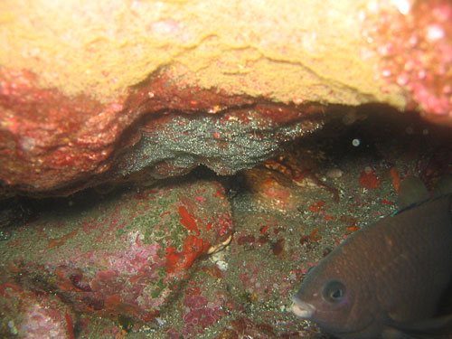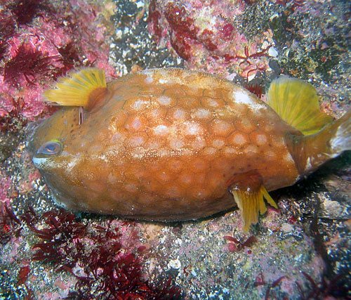 そんなうねりのある底土に入ったのですが、うねりのせいで手前側はなんだか茶色っぽい・・・暖かくはあるんですが、うねりと濁りはつらいもんです。そんなうねりにやられたのか、死にかけのハコフグが横たわっていました。かなり痛手を負っていたらしく片目もなくなり、息も絶え絶え、まともに泳げなくなってました。