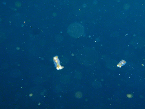 水底付近には、追いかけ回したりすると、体の色をコロコロ変えながら逃げてき、そして切羽詰まると、ちいさなちいさなイカ墨をいっちょ前に吐いたりするイカの赤ちゃんがたくさんいました。