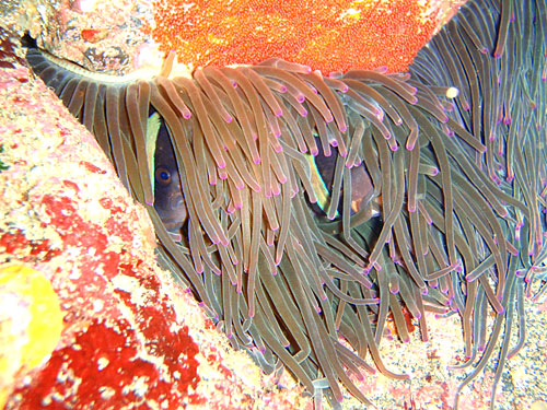 アーチの近くにいるクマノミは卵をしっかり産み付けていているのですが、あまりダイバーが入らないためか、近寄るとすぐに隠れてしまい、なかなかでてきてくれません。
