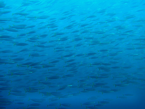 そんな中でも、大きなムロアジの小群が行ったりきたりしており、帰り際に大群を発見したので、少し近寄り中層で待っていると前後左右とすっぽりと包んでくれました。たとえムロアジであったとしても、大群に包まれるとなんとも幸せな気持ちになります。