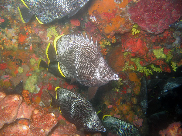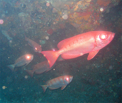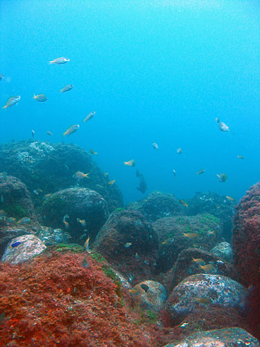 ユウゼン玉は健在で、流れを避けるように馬の背の穴の中にワシャワシャと集まっていました。ぽこっとお腹が大きくなった子も増えてきてます。最近、中層を泳いでいたホウセキキントキも、水温も上がり流れもあったためか、水底付近にたまっており、ムロアジの群れや、小ぶりのヒレナガカンパチなども周ってきてました。