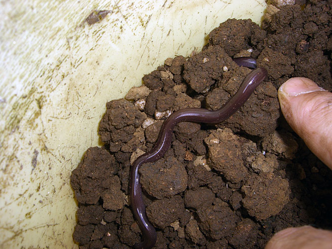 そんなこんなで、庭の片付けをしていたら、石の下にメクラヘビを見つけました。別名ミミズヘビといわれるだけあって、ミミズにそっくり。でも、よくよく見てみると、しっかりうろこもありますし、チョロチョロ舌をだしたりします。