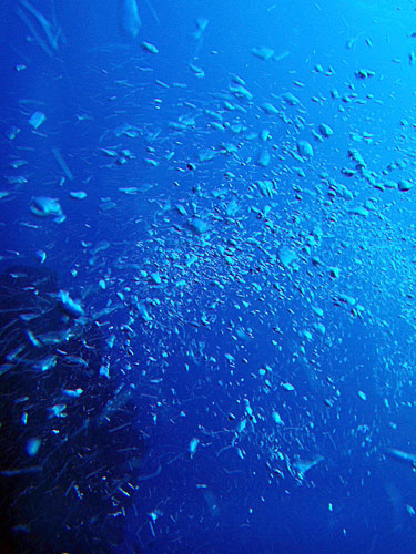 そんな中、でっかいイソマグロが4匹。ゆったりと激流に逆らって泳いできたので、根にしがみつきながら必死に撮った写真は、思い切り魚影すら写っておらず、海の蒼さがただただキレイな一枚となってしまいました。流れ速すぎて横向くのつらかったのと、思いのほか遠かった・・・