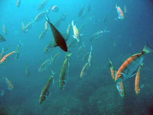 とりあえず、大物狙いで頑張って流れに向かって根に張りつき、しばらく待ってはみたものの、ムロアジ、ムロアジ、カンパチ、ムロアジ、またムロアジ・・・ 透明度のよい馬の背の先でも、何かでる予感もせず・・・