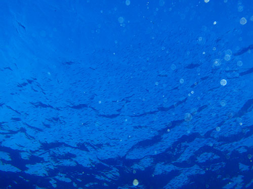キビナゴも水面付近をキラキラ群れで泳いでおり、ツノダシのペアとチョウチョウウオ数匹が、セダカスズメダイ1匹にものすごく威嚇されてました。数と体の大きさではセダカスズメダイを完全に圧倒しているのに、散り散りにされてました・・・