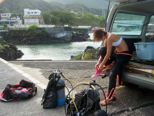 風も強く雲も多く少しどんよりしていた今日の八丈島。海の方は、南西側は風波でバシャバシャでしたが、北東側はぺったりでしたので、本日は底土でOW講習。