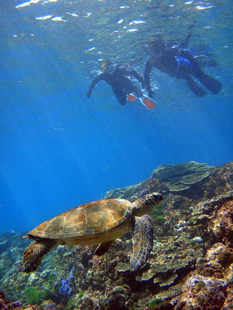 あとはスノーケリングも底土でやって、こちらも差し込む日差しが気持よく、綺麗なサンゴに綺麗な魚達に、アオウミガメも見られたりもして、秋晴れの八丈島を楽しんで頂けた様子。