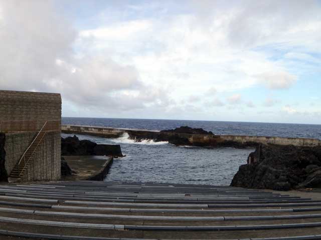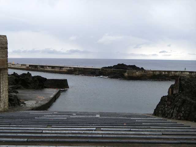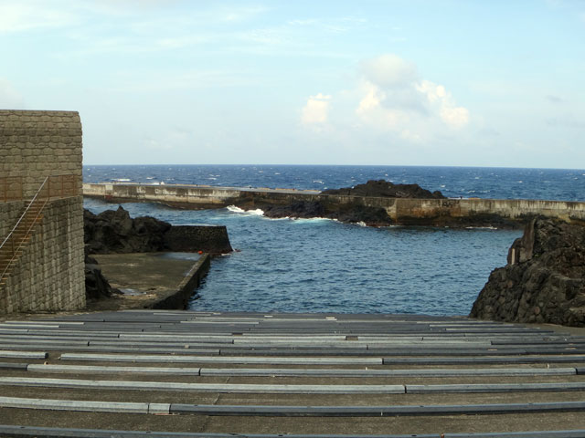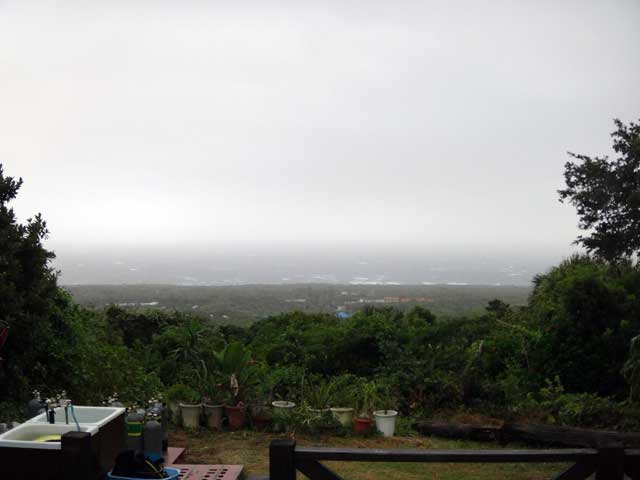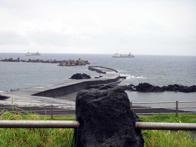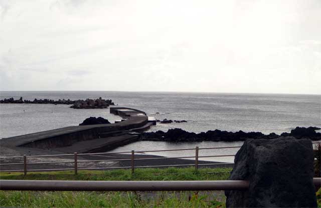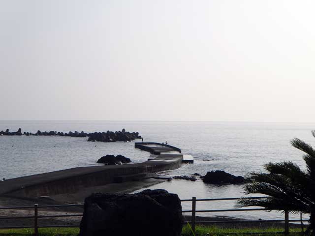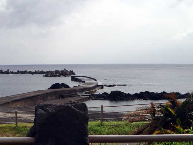 雲の隙間から青空も見られるが雨もザーッと降って落ちつかない空模様となっていた今日の八丈島。海の方は、南西側は風波でバシャバシャ、北東側はぺったりでした。