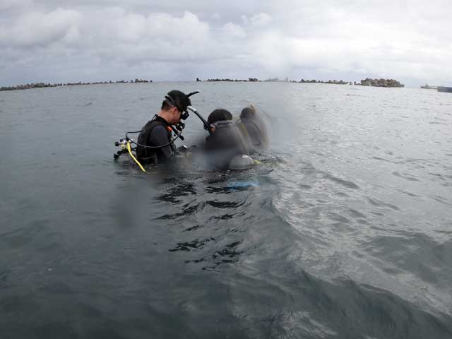 連休前から順調に進んでいたOWDコースは今日で最終日。天気も海況もちょっと怪しくはなっていましたが、今日までは穏やかな海況でしっかり講習をやらせて頂いたので、うねりにも負けないくらい落ち着いて潜って頂けました。