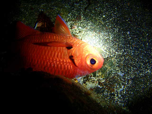 それでもウメイロは元気に群れてましたし、それに混じって小さなヒレナガカンパチも数匹。そして水の流れがないためか外よりも少し暖かな穴の中には、、アカマツカサが群れていて、普段は深場にいるキビレマツカサが混じっていたりしていました。