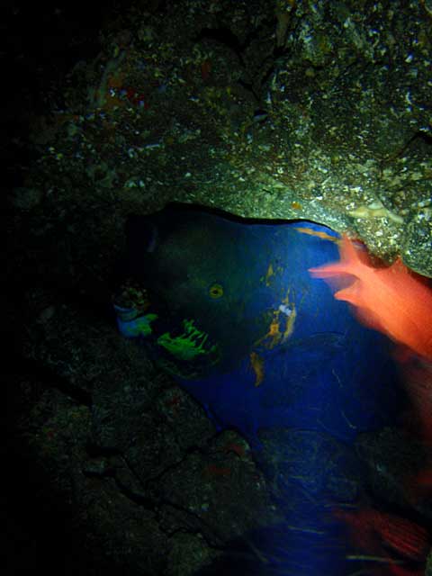 そんな穴の奥深くには大きなアオブダイがジーっと、生きているのかどうかもわからんくらい、身動きもせずにたたずんでおりました。オヤスミ中ですか?