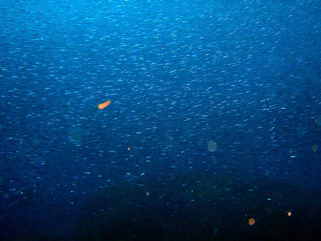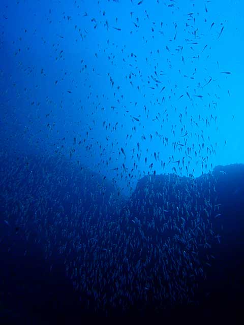 黒潮もしっかりあたり暖かで蒼い海は変わらず。オーバーハングにはたくさんのクロホシイシモチの群れ。沖にはキビナゴの群れを追ってスマが数本周ってきたり、シマアジなんかも見られました。