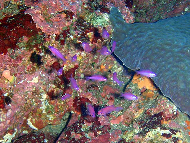 塩通しの良い根にはキホシスズメダイやキンギョハナダイがごった返し、根の陰にはハナゴイの子どもやキビレマツカサもいたりして。