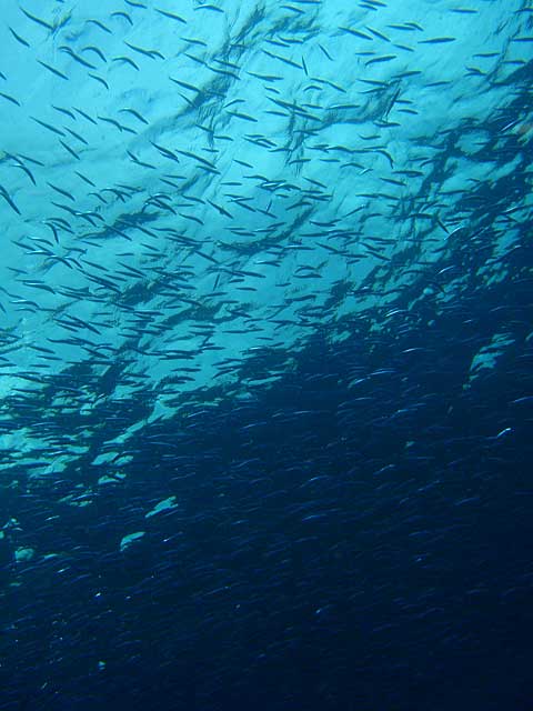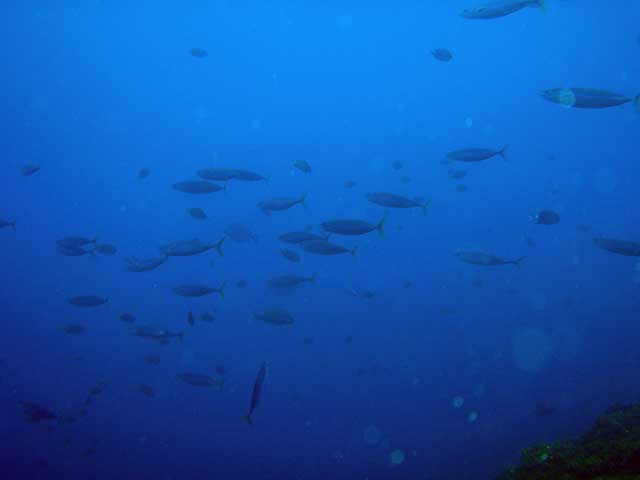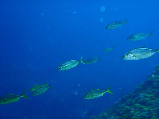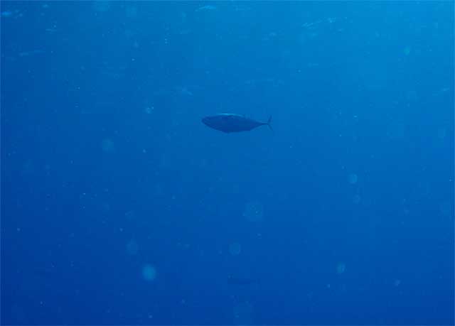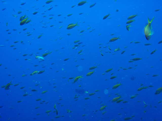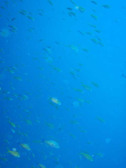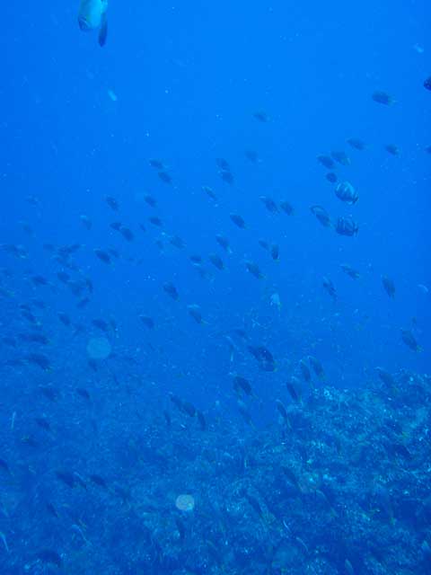 とりあえず流れのないところで、ドリフトダイビングしてみるものの、透明度の悪さがつらいところ。キホシスズメダイに混じってシロボシスズメダイや、シラコダイ、キンギョハナダイが群れてたりもしましたが、ユウゼンはチラホラで、残念ながらユウゼン玉はみられず。あとはマダラエイや小さなアオウミガメ途中、ヒレナガカンパチも現れましたが数は少なく、安全停止中に足元を群れていたりもしたそうですが、まぁ、せっかく窒素だしたのにまた潜るわけにもいきませんし・・・・
