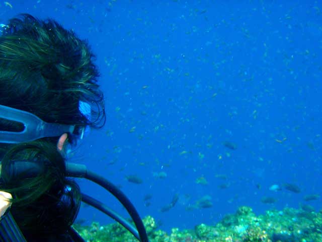 初めは少し不安気でしたが、最後には落ち着いて、潮の緩いナズマドでのんびり一周してきました。途中、スマも一匹飛んできたり、キンギョハナダイの群に囲まれ、講習時には味わえなかった抜けてる八丈の蒼い海を堪能して貰えました。