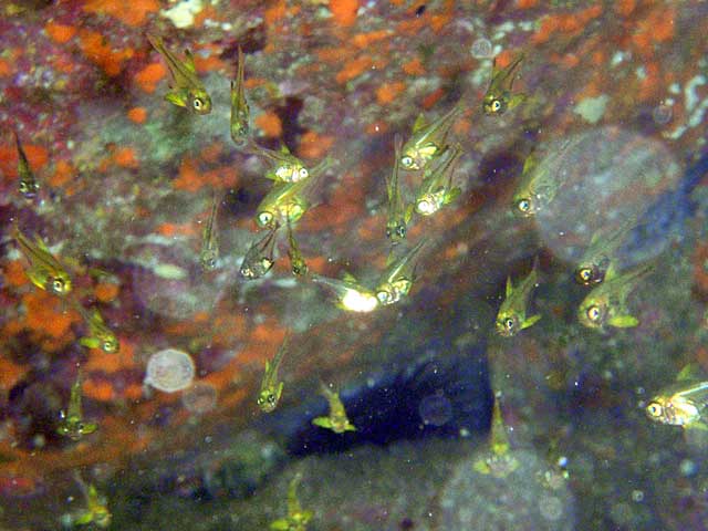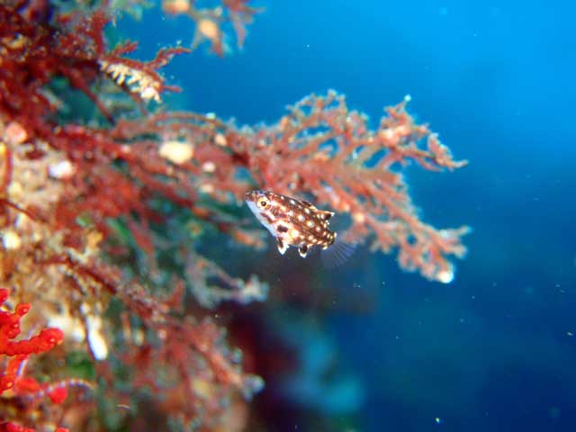 中層にはムロアジとツムブリの群が通り過ぎ、キンギョハナダイとキホシスズメダイは相変わらず。壁沿いにはとっても小さなモンツキベラの子どもたちがワラワラいたり、浅場にはツマグロハタンポの子どもたちがフヨフヨと漂い、一時期いなくなっていたキビレマツカサ玉も復活してました。