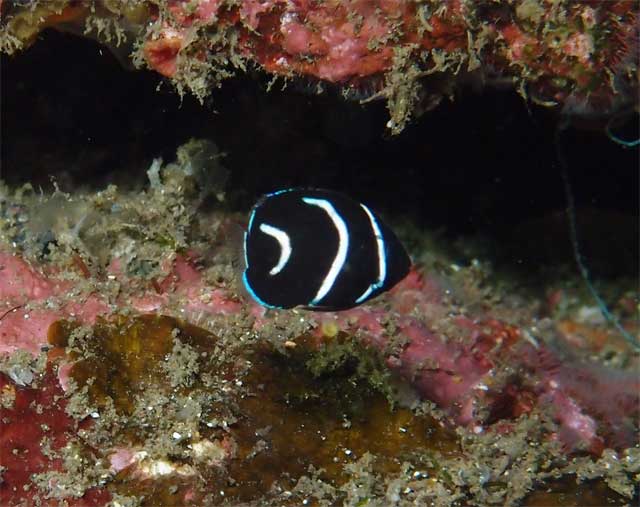 濁りはあるが暖かな海の中で、流れもほとんどない感じで、タテジマキンチャクダイの子ども、ノコギリハギの子ども、