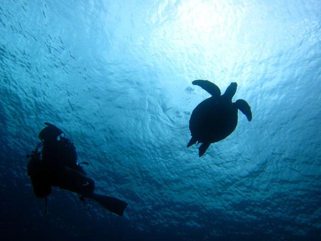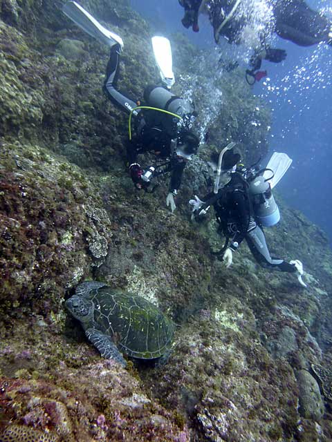 時折入ってくるうねりがちょっと嫌な感じでもありますが、午前中は夏の海が広がっておりまして、アオウミガメやタカベの群れが蒼い海を気持ちよく泳いでもいたり、