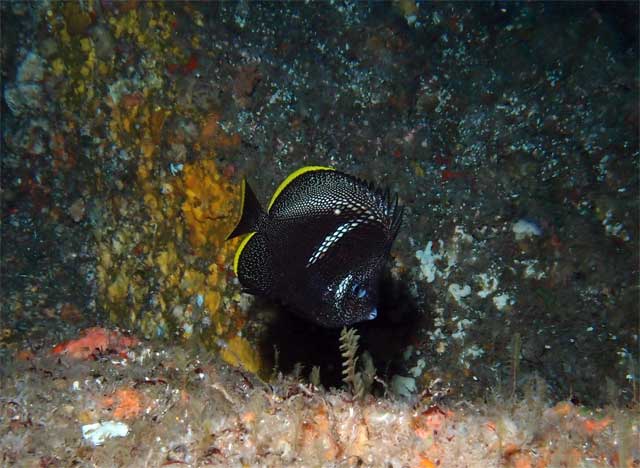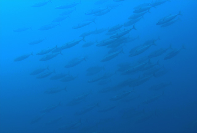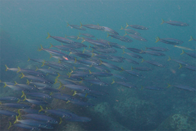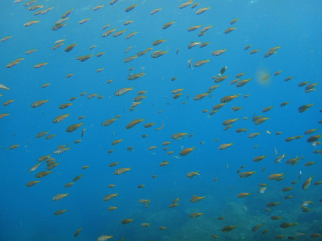 魚達もなんとなく深場の冷たい水を避けて集まってる雰囲気もして、頭の上にはムロアジの群れが通り過ぎ、大きなヒレナガカンパチも周ってきており、キホシスズメダイは子どももおとなもワシャワシャ群れておりました。