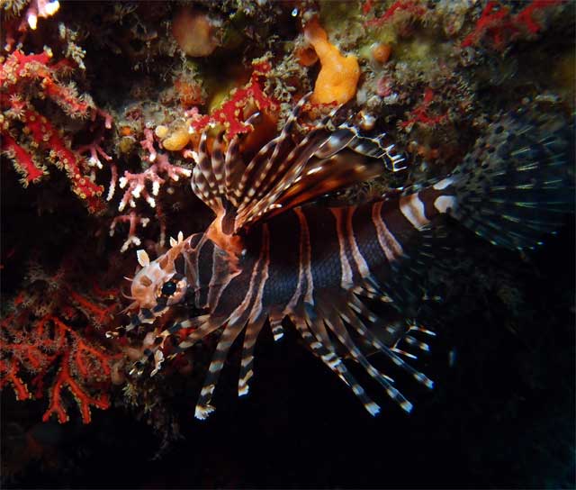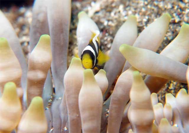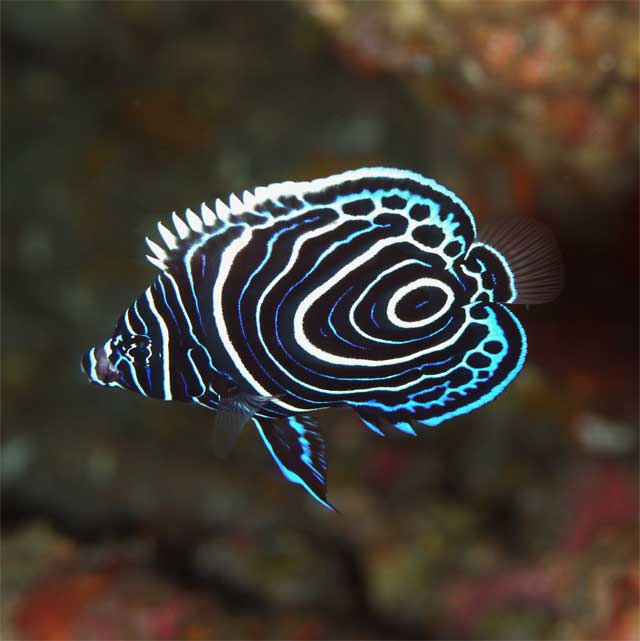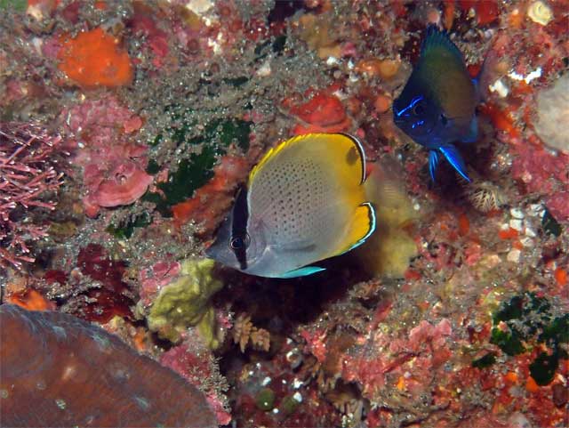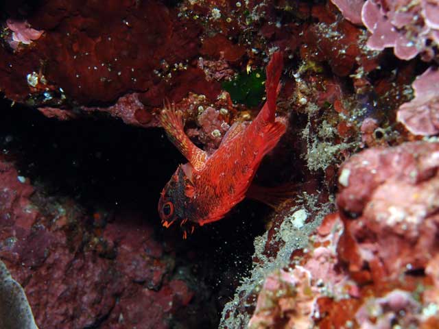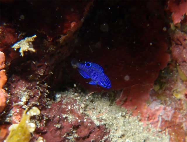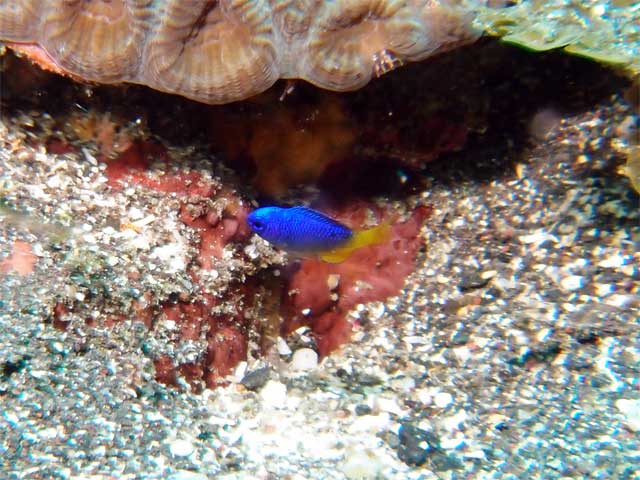 グルッと八重根を周ってみればユウゼンの若いやつは近場と沖にいたりもして、沖のちょっと深いところにはコクテンカタギやコガネスズメダイの子ども、岩の切れ間にフリソデエビなんかもおりました。