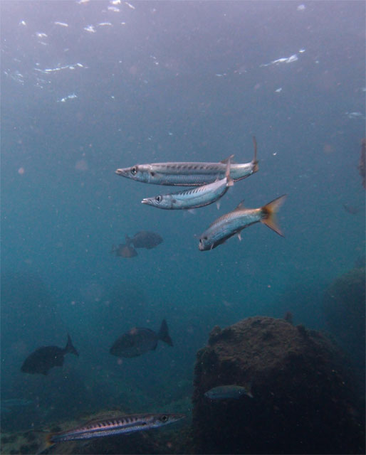なんとなく白濁りは変わらずで沖の方は少し冷たくもなってますが、湾内ではアカカマスが産卵している感じで、その卵を狙ってるのかムロアジがグルグル周っておりまして。たまにアカカマスがムロアジの群れに突っ込んでいってたりもしてました。
