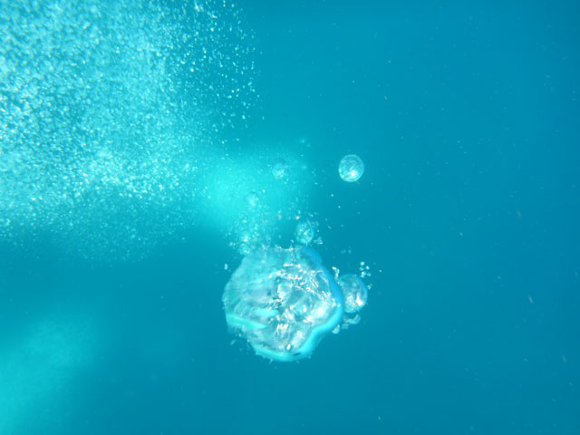 とりあえず浅場は濁りがひどくもありましたが、ダイバーの浮き上がってくる泡に映り込む自分達の姿を見たり、頑張って泳いで頂いてアオウミガメも探してみたり、