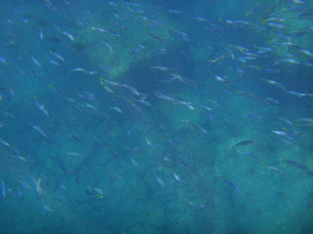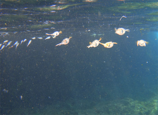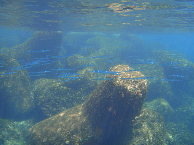 途中ムロアジの群れや小さなカンパチの集まりなんかも見たりもして、静かな湾内にはアカカマスやダツの仲間の群がりに、ゴミの下にはアオリイカの子どもとカンパチの子どもなんかもおりました。