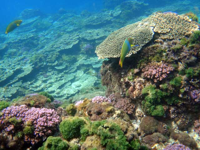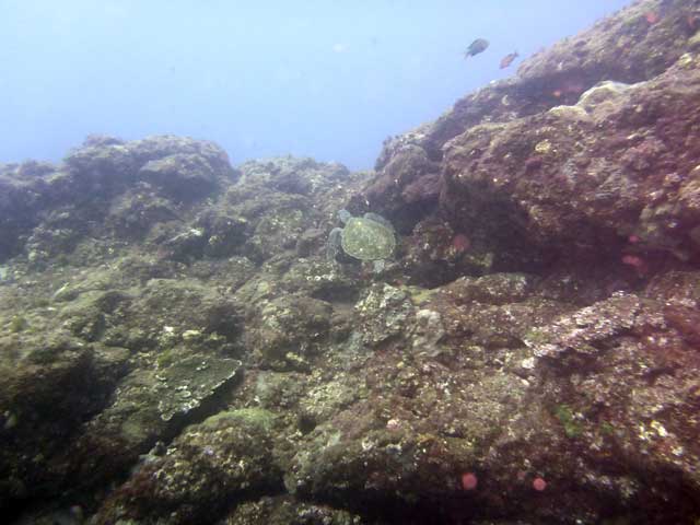 お二人ともに水にも慣れていらっしゃったので沖までちょっと頑張って泳いで頂き、大きな魚や根上に群れてるキホシスズメダイなんかも見つつ、アオウミガメにも出会えたりして。