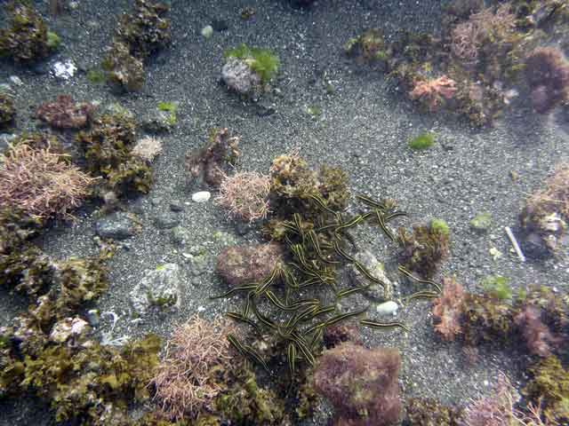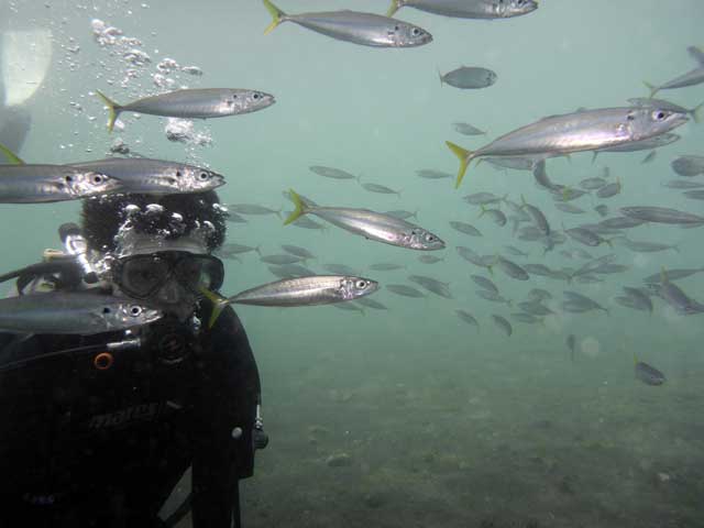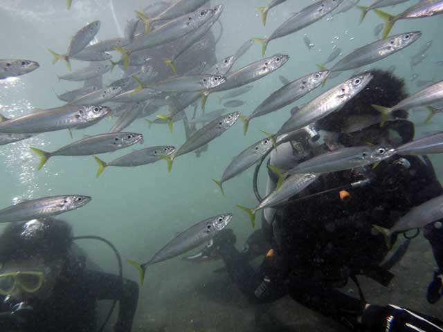 ほかにもC-カードお持ちの方と体験ダイビング経験者の方も今日は底土でムロアジの群れに囲まれつつ、いろんな海の生き物をご紹介して。