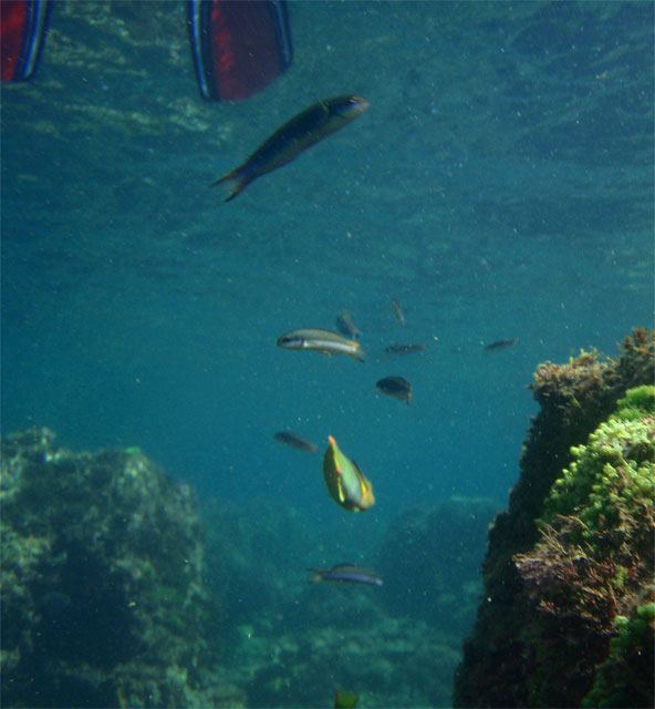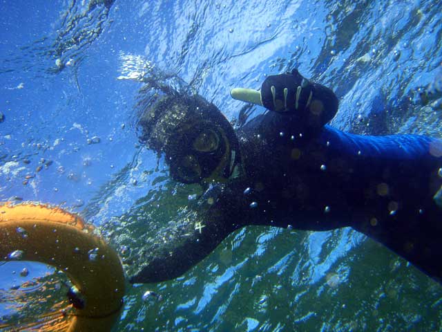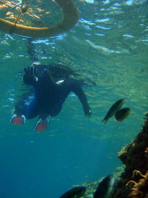 頭の上を海水浴の人たちが泳ぎまくっていたりもしていますが、浅場の砂地にはシマアジやボラがパラパラいたりもして、午前中はゆっくり海に慣れて頂き、チョロっとサンゴの綺麗なところにも行ったりもして、