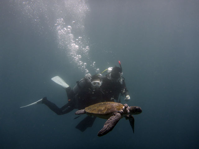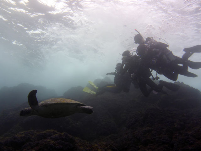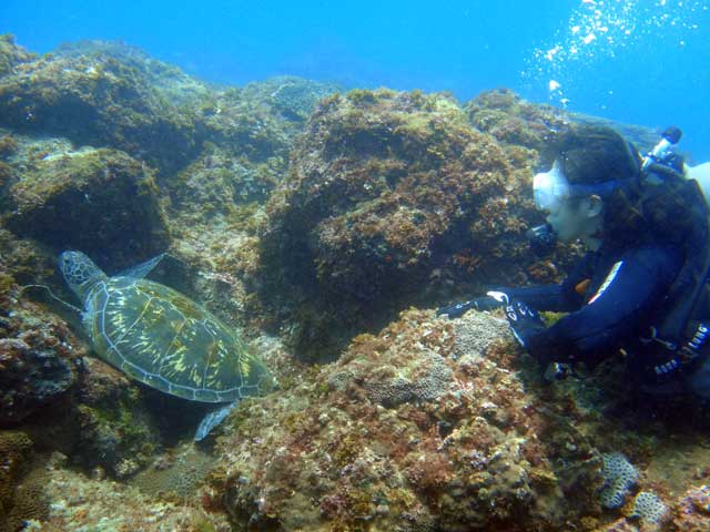 午後からは体験ダイビング経験ありの方でしたので、練習はなるべくサクッとこなして、暖かな海の中をのんびり周ってきてみたり。若干耳が抜けない方もいらっしゃいましたが、無理ない範囲でいろいろ魚も見て、浅場にいた大きなカメと小さなカメも見て頂き、八丈島の海を楽しんで頂けました。