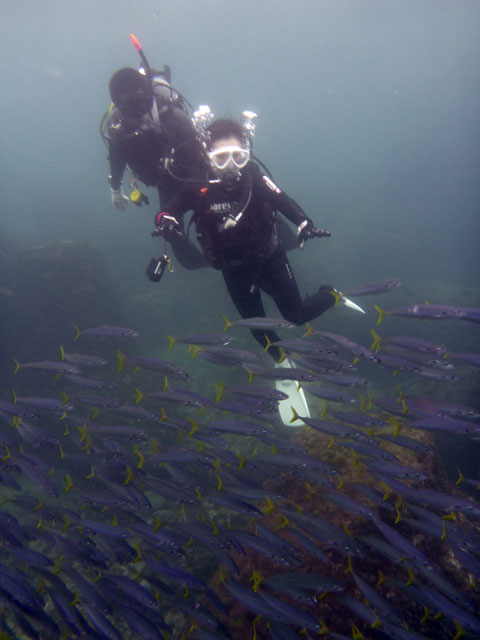 はじめての体験ダイビングの方は足のつくところで練習をして、ニシキベラやカゴガキダイを見ながら呼吸に慣れて頂いて、あとは沖にも出られる八重根に移動してダイビングです。