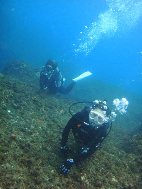 Cカードお持ちの方とダイビングはまったくしたこともないお客様ということで、体験ダイビングに合わせての体験ダイビング同行ダイビング。いつもの体験ダイビングのように、足のつく所で練習もしたのですが、ダイビング未経験の方もぜんぜん問題ない感じでしたので、すぐに場所を移して八重根をグルッと周ってきたりもして。