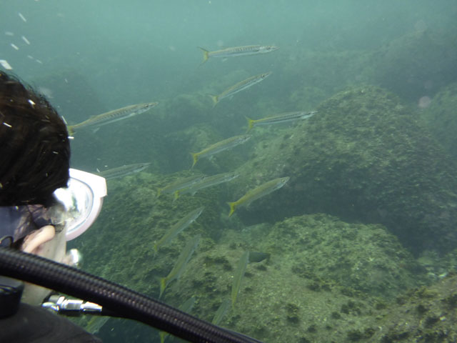 午後はなんだか冷たい水も入ってきておりましたが浅場は暖かで、ムロアジの群れやヒレナガカンパチ、アカカマスにハマフエフキ、ハゼの子どもにソラスズメダイの子ども、アオリイカの子どもなんかもいたりして、