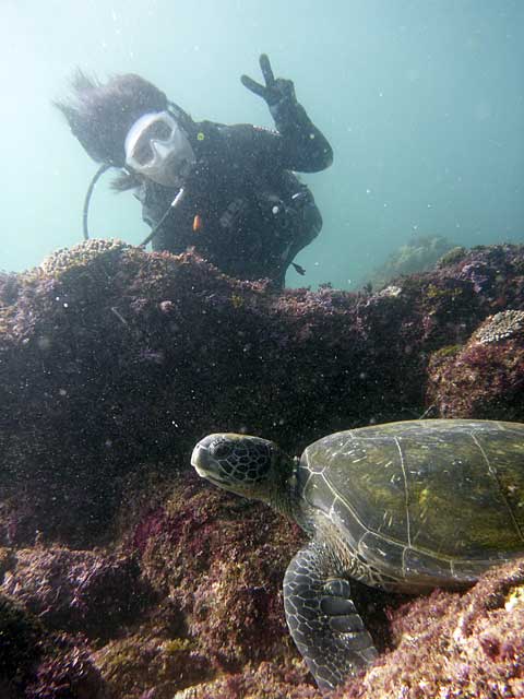 体験ダイビングも八重根でやって、こちらもいろんな魚を見つつアオウミガメと一緒に泳いげたりもして、