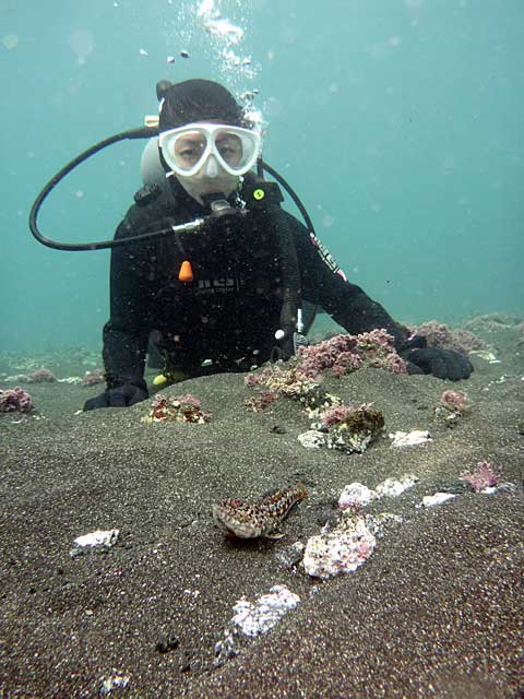 明け方くらいから風が強まってきていて、八重根も少しパシャついてきていたので、本日はペッタリな底土で体験ダイビングです。