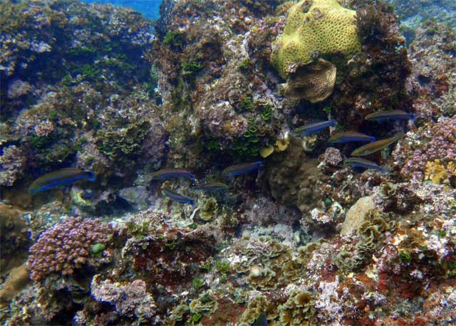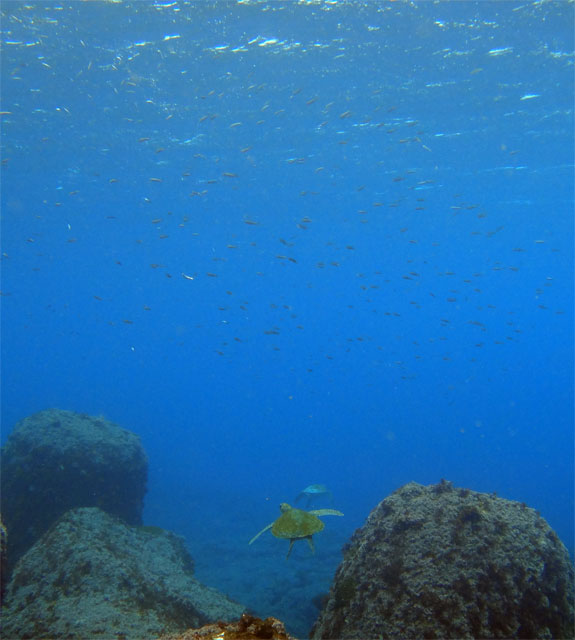 午後からは、午前中にいろいろ慣れて頂いたんで、一気に沖まで泳いで行って、大きなアーチや、アーチに集まるたくさんの魚達を見て頂き、帰りに小ぶりのアオウミガメと一緒に泳いで見てみたり。