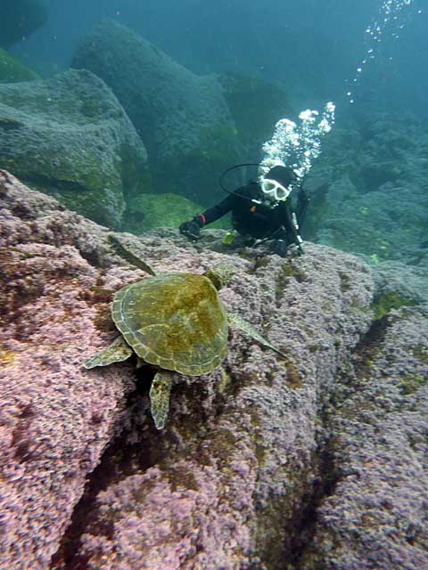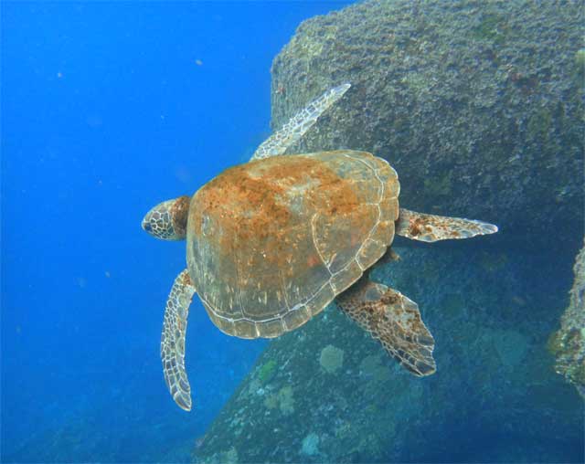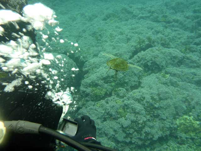 ショップで説明したあと、足のつくところから海に入って、呼吸や耳抜きなんかの練習をして、初めは少し緊張気味でしたが、浅いところをゆっくり行って、アカエソやニシキベラ、ソラスズメダイやアメフラシの仲間なんかをのんびり見ながら、海にしっかり慣れて頂き、初めてのダイビングにしては、呼吸も耳抜きもほとんど問題なかったんで、少し沖まで泳いで行って、大小たくさんのアオウミガメを見てみたり。