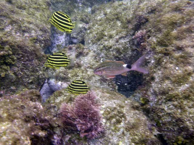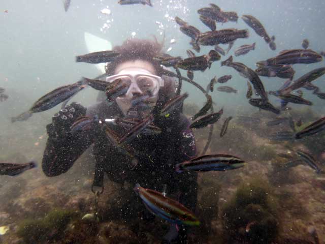 初めはやっぱり足のつく安心できる八重根のタイドプールで練習をして、ニシキベラやコガシラベラにいつものように囲まれたりしながら海に慣れて頂いて、